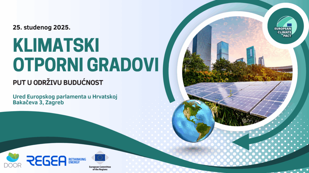 U Zagrebu je 25. 11. 2025., u Uredu Europskog parlamenta u Hrvatskoj, u samom centru grada na adresi Bakačeva 3, održana konferencija „Klimatski otporni gradovi – Put u održivu budućnost“. Skup je organiziran u suradnji Europskog klimatskog pakta i Europskog odbora regija, uz podršku Regionalne energetske agencije sjeverozapadne Hrvatske (REGEA) i Društva za oblikovanje održivog razvoja (DOOR).