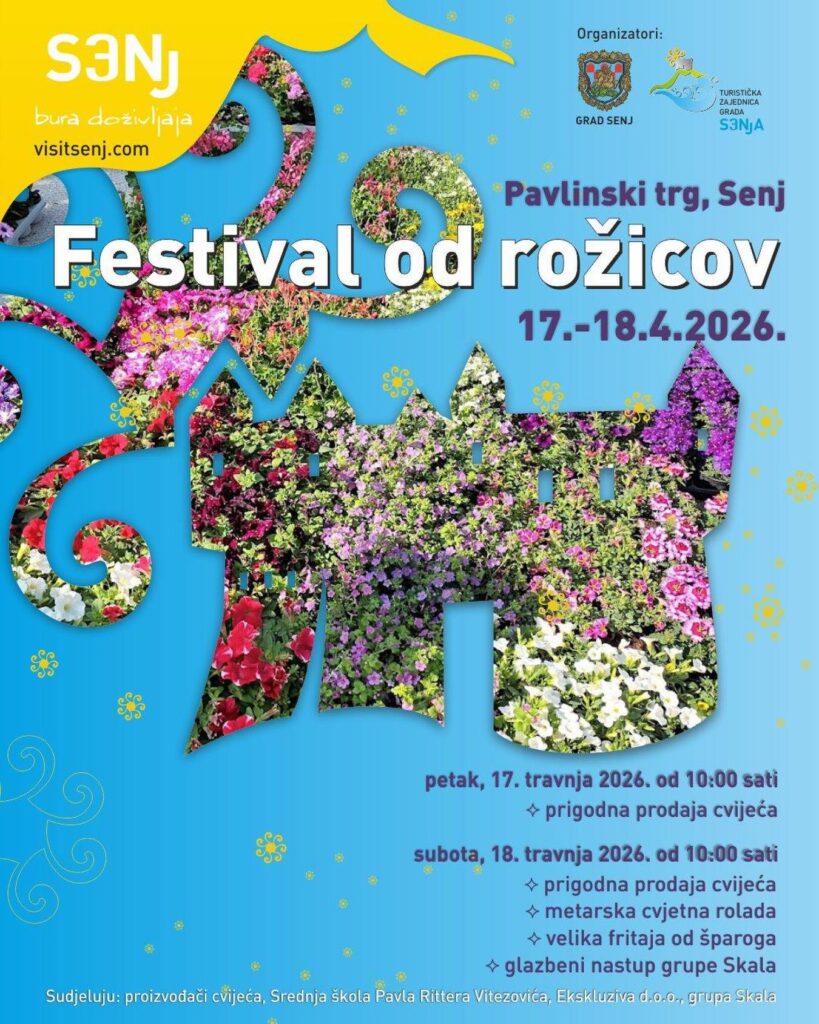 Turistička zajednica Grada Senja i Grad Senj i ove godine s ponosom organiziraju omiljeni proljetni događaj – Festival od rožicov, koji će se održati 17. i 18. travnja 2026. godine na slikovitom Pavlinskom trgu, u vremenu od 10:00 do 19:00 sati.